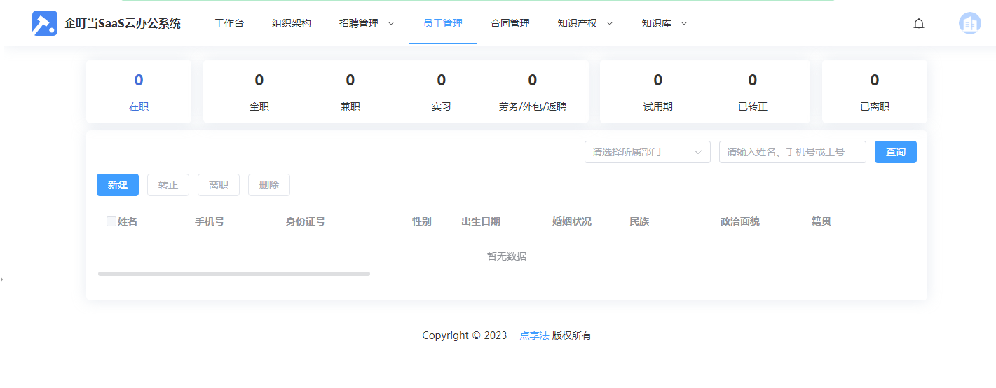 2023-02-07一点享法·企叮当SaaS云办公系统即将重磅上线!企叮当SaaS云办公系统致力于在规范企业员工管理、组织管理、招聘管理、合同管理及知识产权保护等全方面企业合规化运营。